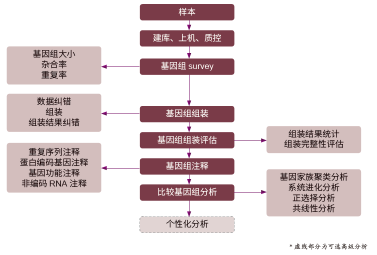 基因组De novo 测序,即在没有参考基因组或不用参考基因组辅助的情况下,利用测序技术和生物信息分析对某物种进行基因组序列图谱拼接,并进行基因组结构注释、功能注释、比较基因组学等一系列信息分析。不仅可以获得物种的参考序列、挖掘功能基因、研究物种起源与进化历史,还为该物种下游一系列研究的开展奠定基础,从而推进该物种的研究。