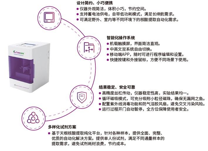 TGuide S16全自动核酸提取纯化仪采用磁棒吸附转移磁珠的方式,利用96孔板、单样本试剂条和磁棒套,同时操作1-16个样本,搭配不同种类的磁珠法核酸提取试剂,可完成质粒提取、琼脂糖凝胶回收纯化、动物、植物、细菌、真菌等多种样本的DNA/RNA提取纯化。