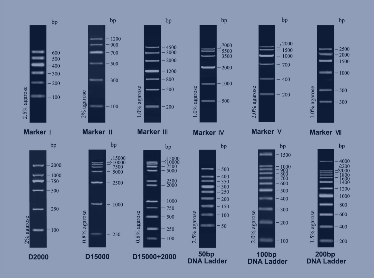 由单一的DNA 条带 (PCR 产物或单一酶切产物片段) 混合而成,亮度均匀,带型清晰,可用于DNA 定量的参照物。每种分子量标准中都有一条带更亮(含量约为100 ng),便于电泳后观察。